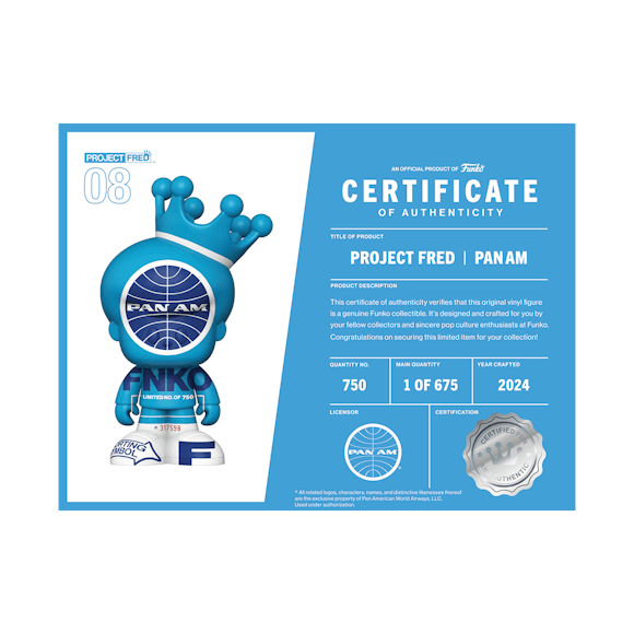 This edition of Project Fred features Freddy Funko personifying the Pan Am brand. This 11-inch-tall collectible is a substantial and sophisticated addition to a premium collector’s display. There’s a 1 in 10 chance you’ll find the chase version of Freddy in an alternate color palette design featuring the Pan Am logos and branding. Only 750 of this hard vinyl collectible were made, verified with a certificate of authenticity, making it a cherished addition to your set. Now it’s your chance to bring together your collection with the Pan Am Edition of Project Fred figure.